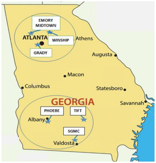 Cancer Centers in metropolitan Atlanta and Southwest Georgia assisting in study recruitment of breast cancer survivors. SGMC = South Georgia Medical Center.