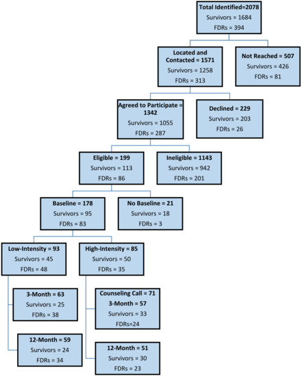Recruitment of breast cancer survivors diagnosed during 2002–2009 began in May 2012, and telephone-based communications with survivors and FDRs continued through September 2014, as summarized in Figure 2 (CONSORT schema).