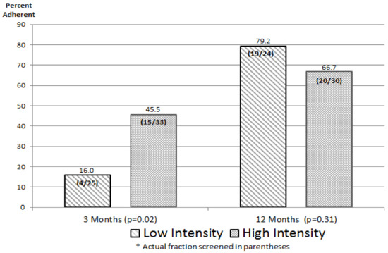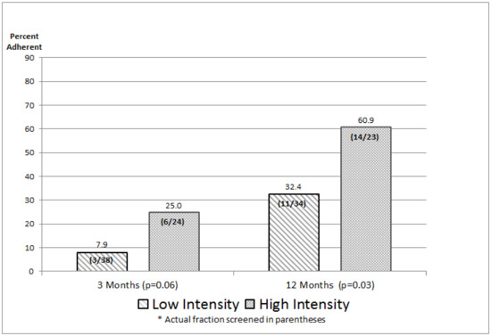 The relative, and absolute, impacts of the interventions on achieving recommended breast cancer screening are summarized in Figure 3. At three months, survivors in the high-intensity arm were significantly more likely than survivors in the low-intensity arm to report having received a mammogram (45.5% vs. 16.0%, p = 0.02). However, at 12 months, there was no significant difference between the interventions (66.7% vs. 79.2%, p = 0.31). Thus, there was a rapid increase in screening in the high-intensity arm closely following the delivery of the multicomponent intervention. Between the three-month and 12-month reporting points, there were gains in both arms, but notably more so in the low-intensity arm. Pooling across arms, 39/54 (72.2%) of these survivors (all of whom were nonadherent at enrollment) had received surveillance mammography by month 12 of the study.