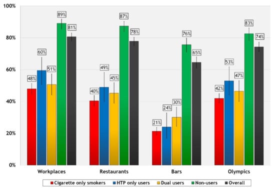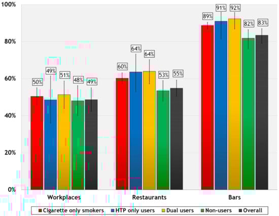 Evidence from Japan and many other countries shows that partial smoking bans are not effective [,]; however, previous research has found that the majority of restaurants and bars in Japan in 2018 still allowed smoking in some areas, in accordance with the existing allowances under national legislation []. As a result, this study found that smoking and SHS exposure in these venues was very high—especially for bars. Approximately half of all workplaces (49%) and restaurants (55%) and over three-quarters of bars (83%) had smoking in 2018. Another important finding from this study is that overall, the majority of the Japanese public agree that cigarette smoking should be completely banned in public places. As expected, support for complete smoking bans was lowest among cigarette smokers and much higher among non-users, and non-users were also less likely to be exposed to SHS in public places than tobacco users. However, there were few differences between types of tobacco users (cigarettes, HTP, and dual users) on each of the outcome variables.