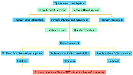 The designed questionnaire included both multiple-choice and open-ended questions. The multiple-choice questions sought to investigate and characterize the interviewees’ attitudes and perceptions. The open-ended questions aimed to extract the specific reasons for the farmers’ behavior. The questionnaire comprised five sections, based on the five categories of information needed, and was composed of basic family information such as household income, farmers’ perceptions of environmental changes after the DCPs, farmers’ attitudes towards the DCPs, farmers’ environmental awareness, and farmers’ suggestions about the DCPs.