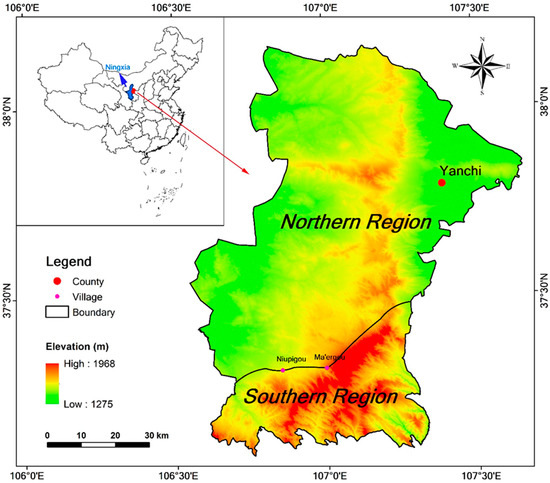 Location of Yanchi County. Ma’ergou and Niupigou are two villages in the boundary between the northern and southern region.