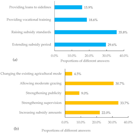 The farmers’ suggestions about how the subsidy policy should be adjusted (Figure 3a) were as follows, in descending order: raising subsidy standards (35.8%), extending subsidy period (29.6%), providing vocational training (18.6%), and providing loans to sidelines (15.9%). Therefore, what the farmers wanted most was to increase the total amount of the subsidy they could get. The total amount of the subsidy could be increased by raising the existing subsidy standards or by extending the time period of the subsidy. Regarding how to regulate illegal grazing activities, the farmers’ suggestions (Figure 3b) were, in descending order: strengthening supervision (33.7%), allowing moderate grazing (30.7%), increasing subsidy amounts (22.0%), strengthening publicity (9.04%), and changing the existing agricultural mode (4.52%). It should be noted that a considerable proportion of the farmers proposed the notion of allowing moderate grazing, which was against current regulations. Additionally, many farmers individually proposed diverse suggestions for improving the DCPs, such as the implementation of rotational grazing. Although these suggestions were not included in any multiple-choice questions, they were properly documented.
