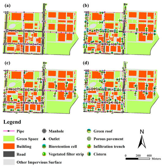 - You, L.D.; Xu, T.; Mao, X.H.; Jia, H.F. Site-scale LID-BMPs planning and optimization in residential areas. J. Sustain. Water Built Environ. 2018, 5, 05018004. [Google Scholar] [CrossRef]