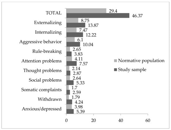 In relation to the first objective (see Figure 1), the comparison of averages indicated statistically significant differences between the sample studied and normative population, with higher scores in the sample studied regarding anxiety (t = 6.65, p = 0.048, d = 0.34), being withdrawn (t = 2.46, p < 0.001, d = 0.86), social problems (t = 2.96, p < 0.001, d = 0.86), attention problems (t = 3.376, p < 0.001, d = 0.85), and aggressiveness (t = 4.096, p = 0.002, d = 0.59). There were also significant differences in the broad band syndromes of internalization (t = 4.145, p = 0.003, d = 0.57) and externalization (t = 4.418, p = 0.002, d = .58) and in the total behavioral problems (t = 4.465, p < 0.001, d = 0.66). Considering that effect sizes of less than 0.20 are considered small, from 0.2 to 0.8 are considered medium, and more than 0.8 are considered large, the study of the effect size indicates that the magnitude of these differences is greater for withdrawal/depressive and attention problems.