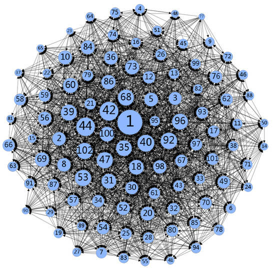 Some nodes (e.g., individuals 1, 8, 31, 35, 36, 44, 47, 53, 56, 60, 68, 69, 73, 92, 96, 100, 102) have a large Freeman’s betweenness. This shows that these doctors are directly linked with other doctors, and information exchange is frequent. In the information dissemination network, the node (i.e., the individual) is in the subcore position.