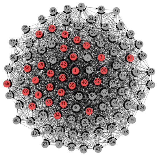 Figure 2 shows the core–edge properties of the data. Round boxes represent individual doctors, red represents individuals with core attributes, and gray represents individuals with edge attributes. Among them, some doctors (individuals 1, 2, 3, 8, 10, 12, 31, 34, 35, 36, 39, 40, 42, 44, 47, 53, 56, 61, 62, 66, 68, 69, 73, 84, 86, 87, 92, 96, 100, 102) are in the core area. According to the calculation results, the core area network density in the network is 0.455, and the periphery area network density is 0.181. The periphery area network density is lower than the core area network density and is also smaller than the overall network density. By comparison, the density of the core area network is greater than the overall network density, which is related to the core position of the behavioral leader.
