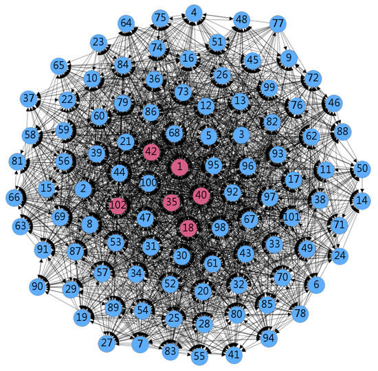 Since the core and periphery area networks have significant differences, there are “structural hole” structures that can be connected to the two areas. Based on the above analysis, some doctors (individuals 1, 3, 18, 31, 35, 39, 40, 42, 44, 73, 92, 96, 100, 102) have a large intermediate center, indicating that these 14 nodes are likely to occupy the structural hole position. Additional indicators are needed for verification. By comparing effective size, efficiency, and constraint, it can be found that individuals 1, 18, 35, 40, 42, and 102 are located in the structural hole of the network (i.e., the middleman of the network), and the degree of reciprocity is high. Doctors in such nodes can connect to two areas, or they can bring location benefits through a reciprocal relationship with the structural hole location (Figure 3). Figure 3 shows the properties of the structural holes in the data. A red round box represents an individual with structural hole properties. The solid lines with arrows connecting individuals represent information interactions between them.