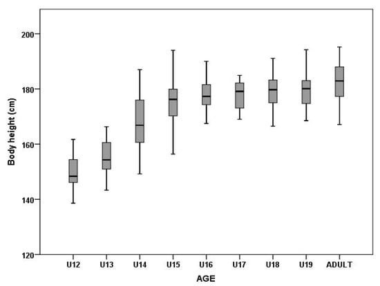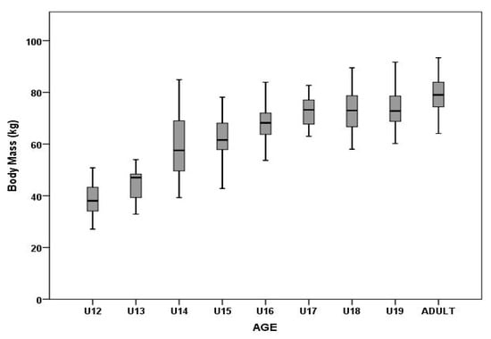 The main factor of age showed a significant effect on BH (F8,346 = 64.68, p = 0.00, η2p = 0.60) and BM (F8,346 = 73.66, p = 0.00, ηp2 = 0.63) in male soccer players (Figure 1 and Figure 2). Post-hoc analysis showed significant differences among players in the U12–U15 categories (Table 2). BH was not significantly different among players in the U16–U19 categories (Table 2). Adult players had the highest BH values (182.5 ± 6.6 cm). Significant differences in BM were found between adult players and U12–U18 players (Table 2).