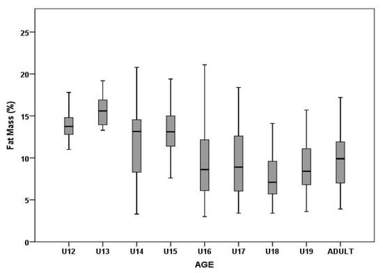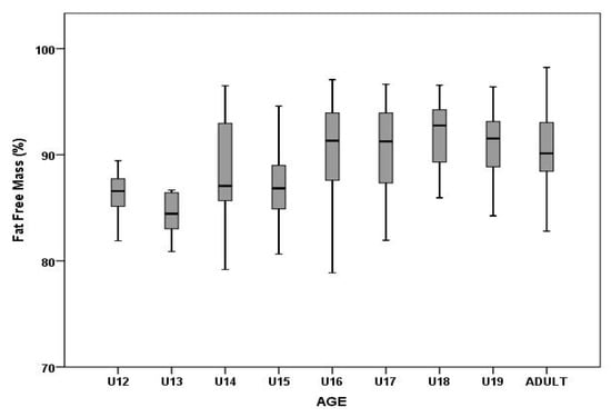 Age showed a significant influence on both FM (F8,346 = 12.34, p = 0.00, η2p = 0.22) and FFMr (F8,346 = 10.98, p = 0.00, η2p = 0.20). FM in younger players (U12–U15) was higher than 10%, whereas older players (U16–adults) had lower FM values (< 10%, Figure 3). Multiple comparisons of means among the observed groups are presented in Table 3. The highest percentage of FFMr (91.89 ± 3.27%) was observed in the U18 category. Players in the U12 and U13 categories showed more homogenous values than older players (Figure 3 and Figure 4).