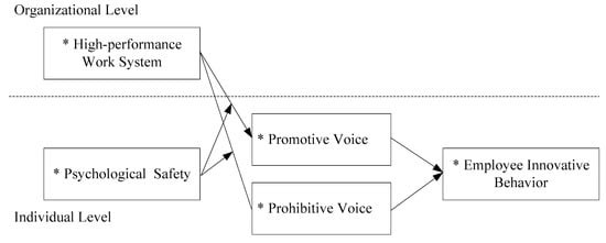 Through conducting employee participation, authorization, and information sharing practices, high-performance work systems develop extensive cooperation between the employees, enrich the information sources for organization development, encourage employees to think from multiple perspectives, and provide an open atmosphere which is conducive in promoting innovation. With adherence to the principle of mutual benefit, employees will develop a sense of sound organizational commitment, trust, and identity [], and thus propose a promotive voice for the interests of the organization. Meanwhile, the organization accepts and approves plans to increase the benefits of the organization or applicable suggestions to improve the organizational procedures. This is helpful to strengthening the willingness and confidence of employees to implement the plans, thus contributing to the generation of innovative work behavior. Therefore, we propose: