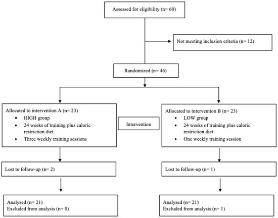 Twenty-three women had been randomly assigned to a HIGH group (age 53.7 ± 9.3 years, BMI 37.9 ± 4.1 kg/m2) and 23 to the LOW group (age 58.7 ± 8.5 years, BMI 36.2 ± 5.7 kg/m2).
