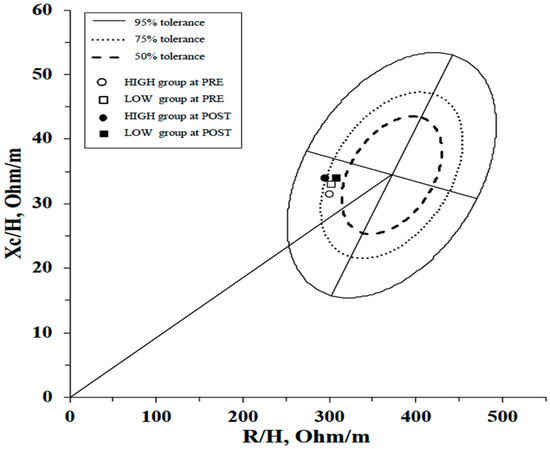 R-Xc graph and vector displacements from before (PRE) to after (POST) the intervention period using the mean R/H and the mean Xc/H plotted on the reference population tolerance ellipses [32]. HIGH: the group with a high-weekly training frequency of three times a week; LOW: the group that performed only one weekly session.