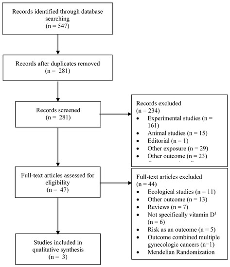 | Prescott, 2013 3 [29] | USA | Prospective cohort | 1989–2011 | 255 | 102,904 4 | UVB flux based on latitude, altitude and cloud cover | Baseline | 0,70 (0.53–0.93) | Age, duration of oral contraceptive use, number of pregnancies, tubal ligation, menopausal status, ever use of post-menopausal hormones and first-degree family history of ovarian cancer. | 6 |