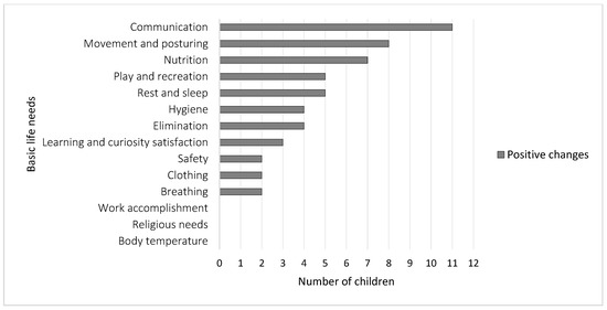 Qualitative analysis of parents’ reports indicated that parents of 11 children recorded only positive changes in their children’s basic life needs, whereas parents of two children (C10 and C13) did not record any changes (Table 3). Furthermore, benefits of THR were determined in 11 of the 14 need theory components (Figure 1).