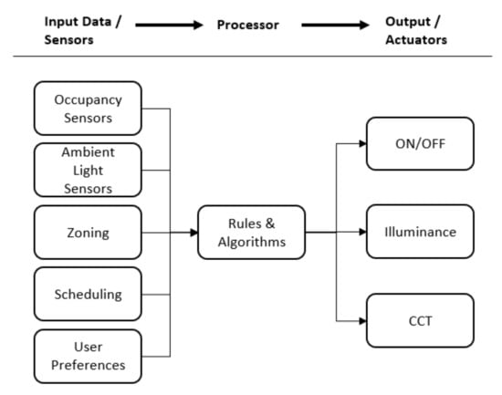 As can be seen, the majority of studies on lighting control systems focused on energy saving [], and they achieved considerable outcomes. As summarized in a review on lighting control technologies [], the saving on energy ranged from 35% to 68% in classroom and office environment. Figure 1 depicts an abstracted lighting control system model for energy saving by referring to the control strategies suggested by Martirano []. Fundamentally, adopting high energy-efficiency LED and turning off or dimming the lights whenever possible are major methods to save energy. A study about the trend of lighting industry indicated that the benefits of promoting LED include not only energy saving and environment conservation, but also increasing automation []. Therefore, almost all pertinent studies used LED as the light source and applied on-off control. Most of them implemented brightness control at the same time, whereas a few of studies implemented CCT control. One motivation using CCT control to improve energy-efficiency might be the influence of different CCT on the occupant’s thermal perception. Some studies argued that occupants sensed warmer under lower CCT (warm light) environment [,], and this could lead to around 8% of the annual energy savings []. However, inconsistent reports can also be found, which rejected the hypothesis of correlation between CCT and thermal sensation []. Essentially, lighting control systems require relevant input data to decide when and how to control the lights. The input data employed by existing studies included different combinations of user configuration and sensor data, such as occupancy and ambient light, zone settings, schedule information, and user preference. Eventually, the core of the system is the algorithm that determines how to drive the lights according to the input data.