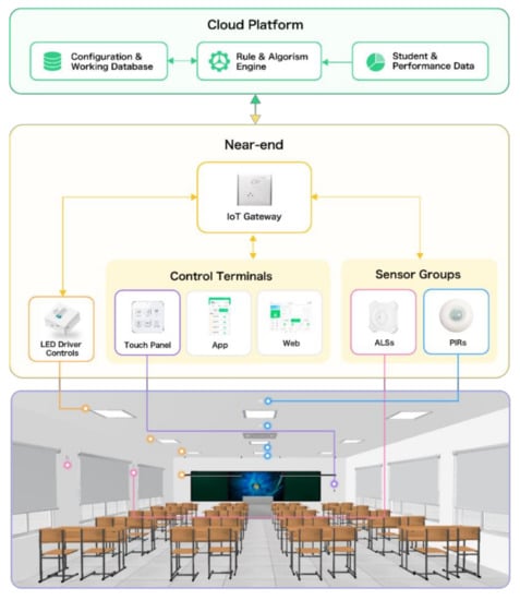 As shown in Figure 2, the learning-context-based smart lighting system mainly consists of four parts at the near-end, including the IoT gateway, the LED lights with driver controls, the control panel, and the sensor groups, as well as a cloud platform at the far-end.