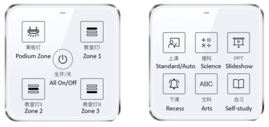 The control panel is a physical touch-panel with several function buttons. The control panel offers the user a convenient and quick way to operate the lighting system, including all lights on/off, zone on/off, and scene switching. Moreover, the button layout and function map of control panel can be customized according to users’ requirements. In this study, two types of control panel as shown in Figure 3 are designed to meet users’ preferences. The one with five touch-buttons is for zone-based switch. The other with six touch-buttons is for scene switching.