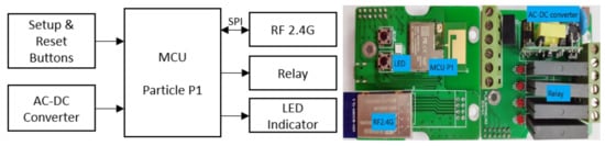Figure 4 shows the block diagram and the PCB (printed circuit board) of the IoT gateway. The main components include a 32-bit MCU (Microcontroller Unit) with built-in Wi-Fi, a RF2.4G module, a 4-way relay, and an AC to DC power module. Details can be found in Table 3. Each way of the relay controls the lighting circuit of one zone. Additionally, the gateway offers four GPIO (general-purpose input/output) ports, which can be used to connect external physical switches. This design provides a contingency plan. User can use the physical switches to turn on/off the lights of each zone, even when the local RF2.4G network is down.
