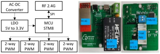 Figure 5 illustrates the block diagram and the PCB of the LED driver control, whose major parts, as listed in Table 4, include an 8-bit MCU, a RF2.4G module, and a set of power module. The LED driver control has four 2-way PWM ports. Each port can connect to a LED fixture’s power driver, and its 2-way PWM controls the cool white LED and the warm white LED, respectively, by controlling the duty ratio of the power output to adjust luminous level and CCT.