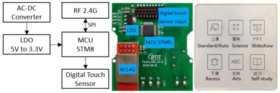 The block diagram and the PCB with its front panel of the control panel are demonstrated in Figure 6. The core component is an 8-key digital touch sensor, whose specification along with the main components are described in Table 5.