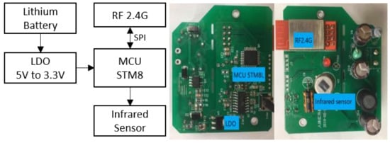 In this study, passive infrared (PIR) sensors are utilized to detect the occupancy of classroom zones. Considering the size of zone, the detection distance of the chosen PIR sensor is about 3 to 5 m. Figure 7 shows the block diagram and the PCB of the PIR module, which mainly consists of an 8-bit MCU, a RF2.4G module, a power module, and a PIR sensor.