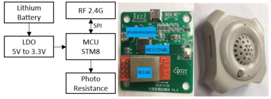 The ambient light sensors (ALS) are employed to measure the luminous level in specific zones. Figure 8 displays the block diagram and the PCB of the ALS module, which mainly includes an 8-bit MCU, a RF2.4G module, a lithium battery, and a photo resistor. In this design, an ADC pin (analog to digital conversion) of the MCU is used for data sampling from the photo resistor. The module regularly works in low-power mode so that the battery life can reach about two years.