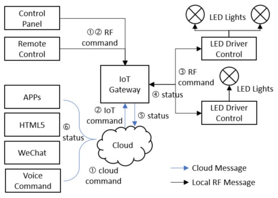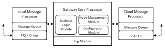 As shown in Figure 9, the embedded software on IoT gateway is composed of three major modules: One core processor and two message processors. The local message processor is responsible for message exchange within the local RF2.4G network, while the cloud message processor is in charge of communication with the cloud platform. The core processor primarily contains a node management module, a business logic module, a configuration module, and a log module. The node management module oversees registration, presence management, and real-time monitoring of sub-nodes at the near end. As the pivotal component of the core processor, the business logic module controls the procedure of business logic, such as scene switching, rule matching, and automation. The configuration module manages the settings of the gateway and synchronizes local configuration with the cloud platform if needed. The log module records the gateway’s working log, which can be used for system alerts and troubleshooting.