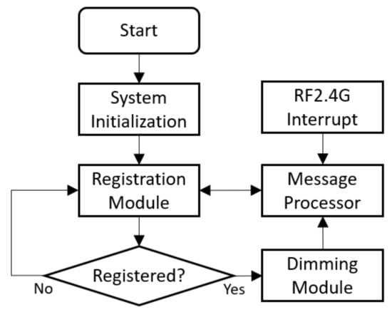 The embedded program running on STM8 MCU of the LED driver control basically includes registration module, message processor, and dimming module. As shown in Figure 10, to secure the communication, the LED driver control must register on the IoT gateway and get a token before any working message can go through. The message processor receives and parses control commands and reports the status of the LED fixture. The dimming module converts control commands into PWM control signals to manipulate luminous level and CCT of the LED fixture.