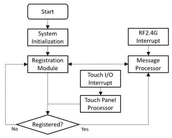 The control panel runs STM8 embedded program, which contains registration module, message processor, and touch panel processor. Figure 11 demonstrates the software workflow. The registration module and the message processor function the same as the modules of LED Driver Control. The touch panel processor takes key press signals and maps then to light control messages. Then, the control message is sent to the IoT gateway by the message processor.