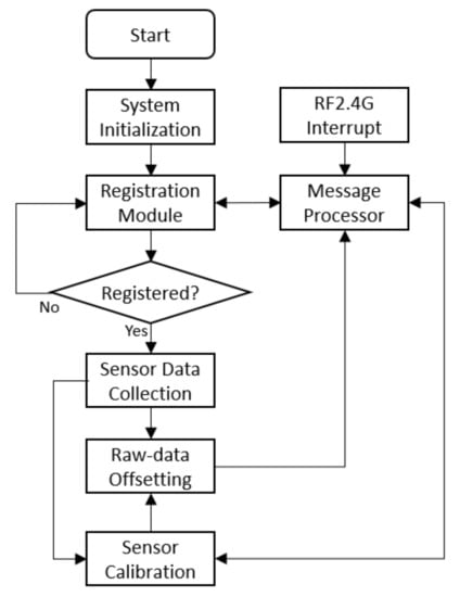 The STM8 embedded program running on sensor module is comprised of registration module, message processor, sensor data collection module, raw-data offsetting module, and sensor calibration module. Figure 12 shows the software workflow. The registration module and the message processor work the same as those of LED driver control. The sensor data collection module gathers raw data from PIR or ALS sensor via digital or analog port of the MCU. ADC and TTL (transistor–transistor logic) are regular methods for raw-data sampling. Next, the raw data are processed by the raw-data offsetting module to compensate sensor drift. Then, the raw data are offset packed into RF2.4 messages and reported to the IoT gateway. To ensure the data consistency over time, the sensor calibration module reports the raw data to the cloud platform on specific occasion. For instance, the calibration of ALS is most likely at mid-night, although it may vary depending on location and outdoor environment. The algorithms on the cloud platform estimate the drift of sensors, determine the offset values, and feed back to the sensor calibration module. Details regarding these algorithms are not discussed in this article but will be discussed in a separate report.