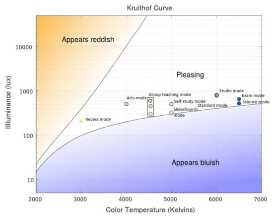 Unfortunately, there is no simple solution for classroom lighting. Lang [] argued that lighting preferences are not fixed but vary depending on many factors, such as classroom size, teaching activity, and individual needs of teachers and students. As a result, it is strongly advised that classroom lighting systems should provide users with the flexibility of lighting control. This opinion has been supported by data from empirical experiments. Studies demonstrated that different illumination configurations, including brightness and correlated color temperature (CCT) [], had different impacts on students’ behavior and cognition, and the impact differed depending on learning context and age group [,,,,,,,]. On the other hand, with the development of LED products and Internet of Thing (IoT) technology, it is no longer a difficult task to perform precise and automatic control of brightness and CCT. Therefore, in a recent literature review, Sun el al. [] concluded that the research focus in this field has shifted to the learning-context phase, with research and engineering priorities to discover and support better lighting configurations for different classroom activities.