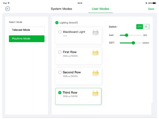 It is noteworthy that more and more learning-context based lighting control systems have been recently proposed for classrooms []. These proposed systems followed existing psychological research findings by applying lower brightness and CCT for subjects like arts and language, and higher brightness and CCT for subjects like science and mathematics [,,]. As summarized in Table 2, these systems provided illumination settings and control methods for a few basic learning scenarios. However, the lighting parameters and learning scenarios discussed in these studies were limited. First, the number of scenarios was not enough to cover the real-world educational activities. For example, elementary and secondary schools in China usually offer more than 10 subjects and activities; and the learning contents and teaching tools also keep changing with the development of economy and society. Second, the lighting configurations were either crude or static, without any dynamic and adaptive mechanisms. Third, the existing systems were only deployed in a few selected classrooms for experiments. Large-scale deployment for educational practice has not been reported.
