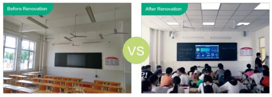 The proposed smart lighting system has been deployed at several schools. One of them was deployed at an elementary school located in Hebei province, China in August 2017. In this project, the florescent tubes of 13 classrooms were replaced by the new LED smart lighting system. The pictures of before and after the replacement can be found in Figure 19.