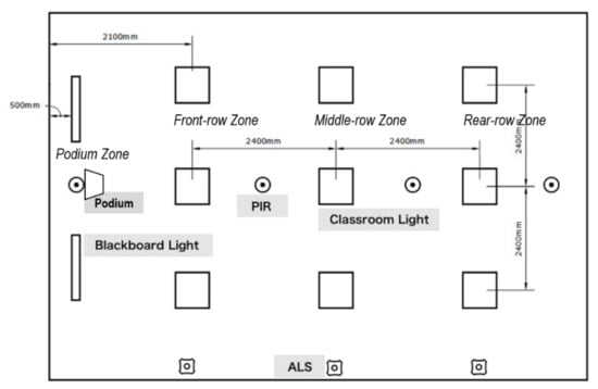 As shown in Figure 20, the classroom space is divided into four zones: The podium zone, the front-row zone, the middle-row zone, and the rear-row zone. The lights can be controlled individually, together, or by zone. Each zone is equipped with one PIR sensor to control the zone lights during non-working hours for energy saving. The three ALSs are distributed at the front, middle, and rear, respectively, on the side wall facing the windows.