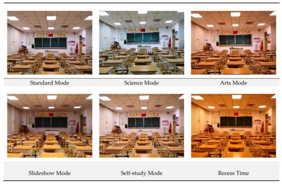 Upon the requirements of the school, six lighting modes were adopted, including the standard mode, the arts mode, the science mode, the slideshow mode, the self-study mode, and the recess time mode. Pictures in Figure 21 demonstrate the actual effect of these modes.