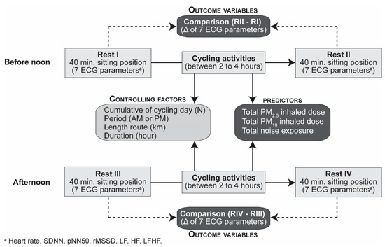 To reduce the impact of traffic-related air and noise pollution exposure, different authors promote healthy living and consistently advocate a shift from automobiles to active transportation, such as cycling or walking [11,12,13]. In urban environments, however, cyclists may still be at increasing risks inasmuch as they have a higher ventilation rate of pollutants, which increases the inhaled dose of air pollutants [14,15]. For instance, a recent study has shown that during rush hours in Montreal, cyclists had 3.7 times higher inhaled doses of nitrogen dioxide than motorists, and they were also exposed to higher levels of noise (1.9 dB(A)) [14]. To this end, several studies have found an association between exposure to traffic-related air pollution [16,17,18] and exposure to noise [2,3,19,20] and their personal impact on heart function. To our best knowledge, there is nonetheless a scarcity of studies in the scientific literature that explore whether and how the simultaneous traffic-related air and noise pollution exposure disrupts the heart function in real-world settings. Thus, the study objective was to examine in real-life setting short-term effects between cyclists’ exposure to air and noise pollution and acute changes in heart rate variability among cyclists in Montreal, Québec. The aim of this study is to assess the impact of total inhaled dose of particulate matter and total noise exposure on the variations of electrocardiogram (ECG) parameters between pre-cycling and post-cycling periods. In other words, all other things being equal, what would be the impact of traffic-related air and noise pollution on the ability of cyclists to recover?