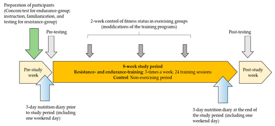 Nutritional intake was controlled at study baseline and at the end of the study. Participants were asked to fill out food diaries over 3 days at the beginning and at the end of the study (see Figure 1). Later, energy intake was analyzed using nutritional tables and software [34]. The study protocol is presented in Figure 1.