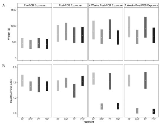 This is one of the first studies to investigate the combined effects of dietary exposure to PCB mixtures and food deprivation on tissue-specific concentrations of total PCBs and homolog groups and functional immune response in a controlled setting. Similar to results of other studies, we observed no effect of PCB exposure alone on fish weight or hepatosomatic index [,]. However, we found that the concentration of total PCBs and homolog groups in the whole body, fillet, and liver can remain elevated for at least seven weeks post-exposure, and that the rate of PCB depuration is tissue-specific and dependent on nutritional status. In particular, we observed an increase in PCB concentrations in the liver of food-deprived fish, suggesting that the mobilization of PCB-rich lipids can have delayed effects on tissue toxicity []. PCB exposure did have immunomodulatory effects; however, the effect of food deprivation was generally stronger for the parameters evaluated.