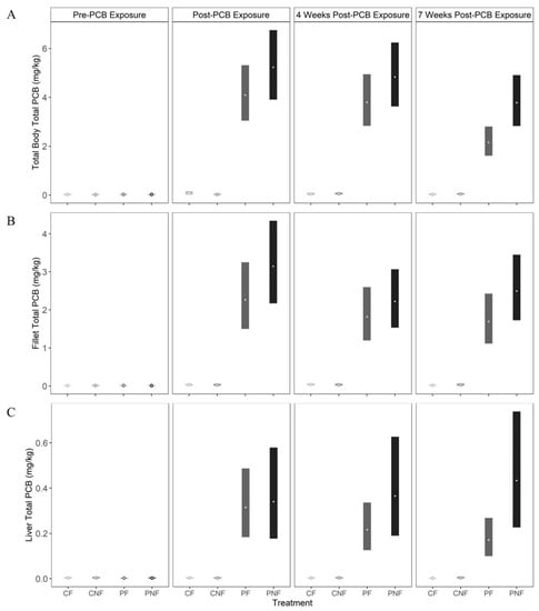 The goal of the PCB exposure phase was to feed fish in the PF and PNF treatments PCB-spiked food until they reached a body burden of 5 mg/kg while feeding fish in the CF and CNF treatments unspiked food. A target concentration of 5 mg/kg was chosen because it is representative of the total body burden found in tissues of wild fish in PCB-contaminated environments []. As described below, we intended the PCB exposure phase to last for eight weeks; however, it took 11 weeks for fish in the PF and PNF treatments to reach the target body burden.