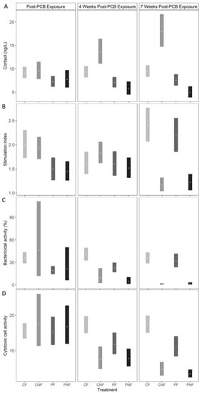 While functional immune responses changed most significantly to food deprivation, the effects of PCB exposure and food deprivation appear to be additive for plasma cortisol. Fish in the PF treatment had marginally lower plasma cortisol concentrations than fish in the CF treatment at all sampling times, suggesting that PCB exposure can decrease cortisol concentrations even after several weeks of consuming a PCB-free diet. Moreover, by T3, fish in the PNF treatment had significantly lower plasma cortisol concentrations than fish in the other treatments. The most notable difference in cortisol at T3 was between fish in the PNF and CNF treatments, highlighting the effect of PCB exposure independent of food deprivation. This result is consistent with those of other studies, which found that fish sampled from contaminated environments lacked the ability to increase serum cortisol concentration in response to acute stress [,], perhaps due to impaired steroidogenesis []. While we did not analyze the pituitary microscopically, other studies have found atrophic pituitary corticotropes in fish exposed to PCBs. This finding suggests that PCB exposure likely attenuates the cortisol response by way of hypothalamus–pituitary–interrenal (HPI) axis disruption [].