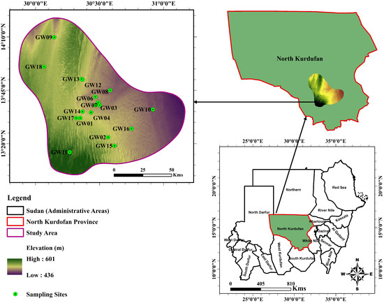 Past studies carried out for Kurdufan regions were limited to hydrological, geological, and hydrochemical properties of the confined and unconfined aquifers [23,24,25,26]. The studies concluded that the groundwater belonging to both aquifers inherited the physicochemical properties of sedimentary formations. In this research, we investigate groundwater quality and heavy metals risk based on the proposed modified heavy metal evaluation index (MHEI) in the case study of North Kurdufan Province, Sudan.