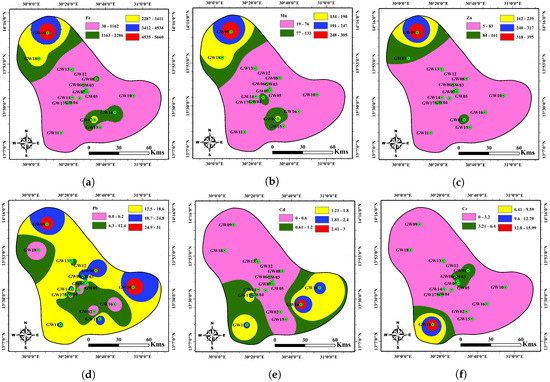 Spatial distribution of heavy metal ions in the groundwater samples and GIS interpolation maps of (a) Fe, (b) Mn, (c) Zn, (d) Pb, (e) Cd and (f) Cr in the study area.