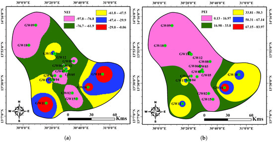 Spatial distribution of groundwater samples and GIS interpolation maps of MHEI (a) NEI and (b) PEI values in the study area.