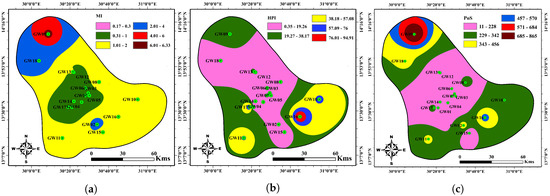 Spatial distribution of groundwater samples and GIS interpolation maps of (a) MI, (b) HPI and (c) PoS values in the study area.