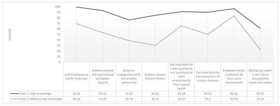 A two-class model was chosen to describe patterns of responses to eight WHP knowledge items. Figure 2 presents the item response probabilities (i.e., the probability that an individual belonging to a latent class will answer in the affirmative to each knowledge item) to eight knowledge items. Class 1 (70.37% of sample) is labelled “High Knowledge” as it includes respondents with high overall knowledge of WHP. Class 2 (29.27% of sample) is labelled “Medium–Low Knowledge” as it includes respondents with fewer correct responses to the WHP knowledge questions.