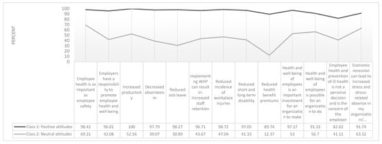 A two-class model was also chosen to describe patterns of responses to 13 WHP attitude items. Figure 3 presents the item response probabilities (i.e., the probability that an individual belonging to a latent class will answer in the affirmative to each attitude item) to 13 attitudes variables. Class 1 (94.41% of sample) is labelled “Positive Attitudes” as it includes respondents with positive attitudes towards WHP. Class 2 (5.59% of sample) is labelled “Neutral Attitudes” as it includes respondents with fewer affirmative responses to the WHP attitude questions.