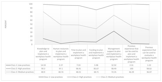 A three-class model was chosen to describe patterns of responses to seven WHP practices related items. Figure 4 presents the item response probabilities (i.e., the probability that an individual belonging to a latent class will answer in the affirmative to each practices item) to 8 practices variables. Class 1 (22.24% of sample) is labelled “Low Practices” as it includes respondents with far fewer affirmative responses to variables indicating practices in place to implement WHP. Class 2 (46.51% of sample) is labelled “High Practices” as it includes respondents with many affirmative responses to the variable indicating practices in place to implement WHP. Class 3 (32.25% of the sample) is labelled “Medium Practices” as it includes respondents with some affirmative responses to the variable indicating practices in place to implement WHP.