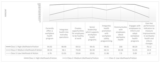 Finally, a three-class model was chosen to describe patterns of responses to eight WHP likelihood of action items. Figure 5 presents the item response probabilities (i.e., the probability that an individual belonging to a latent class will answer in the affirmative to each likelihood of action item) to eight likelihood of action variables. Class 1 (53.72% of sample) is labelled “High Likelihood of Action” as it includes respondents with many characteristics associated with successful implementation of WHP in their organization. Class 2 (31.13% of sample) is labelled “Medium Likelihood of Action” as it includes respondents with some many characteristics associated with successful implementation of WHP in their organization. Class 3 (15.15% of the sample) is labelled “Low Likelihood of Action” as it includes respondents with few many characteristics associated with successful implementation of WHP in their organization.
