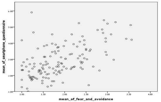 There was a positively high Pearson correlation (r = 0.562; p < 0.01) between problematic smartphone use and social anxiety, suggesting that problematic smartphone use is associated with high levels of social anxiety. There was a positive moderate Pearson correlation (r = 0.569; p < 0.01) between problematic smartphone use and the social fear subscale of the LSAS and a positive moderate Pearson correlation (r = 0.537; p < 0.01) between problematic smartphone use and the social avoidance subscale of the LSAS, both suggesting that problematic smartphone use is associated with moderate levels of social anxiety. See Figure 1 for the correlation between problematic smartphone use and social anxiety.